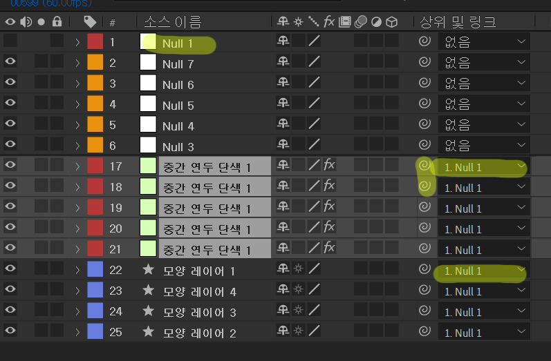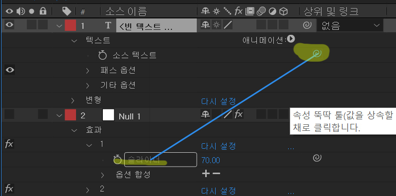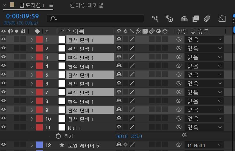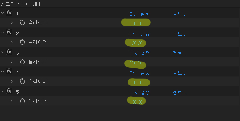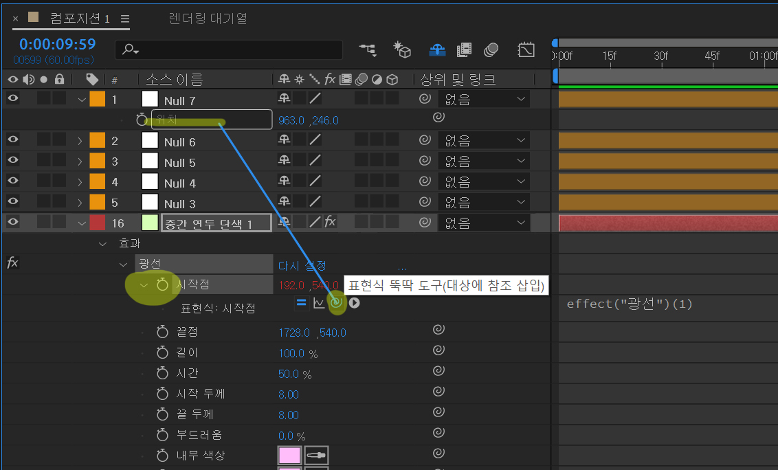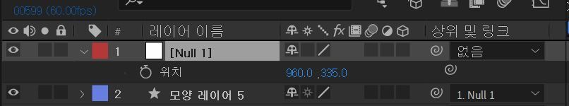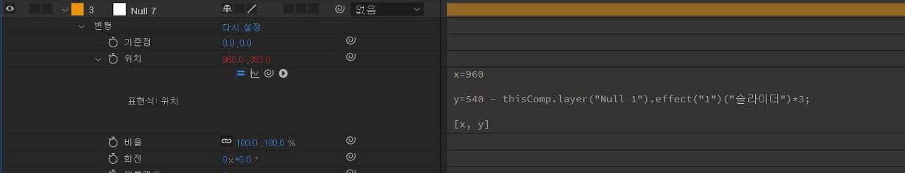 | 첫번째 꼭지점 널7 | x=960 y=540 - thisComp.layer("Null 1").effect("1")("슬라이더")*3; [x, y] |
