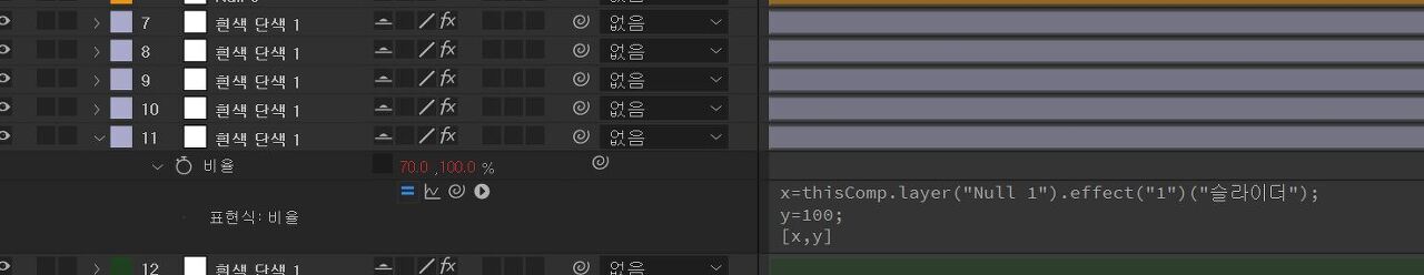 | 두번째 꼭지점 널6 | x=960 + thisComp.layer("Null 1").effect("2")("슬라이더")*2.85; y=540 -thisComp.layer("Null 1").effect("2")("슬라이더")*0.94; [x, y] |