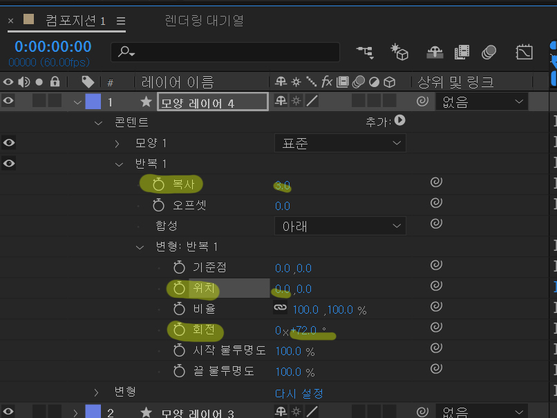 콘텐트->반복 복사 = 꼭지점의 갯수 5 콘텐츠->변형 위치 = 0 회전 = 72 |
