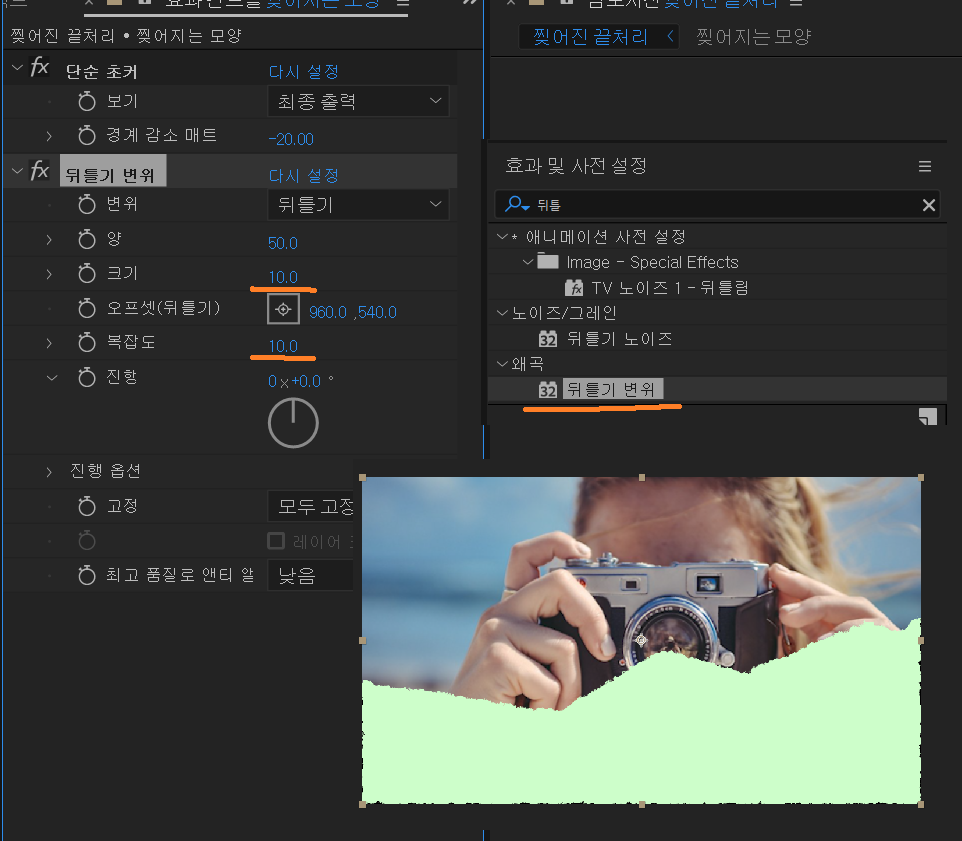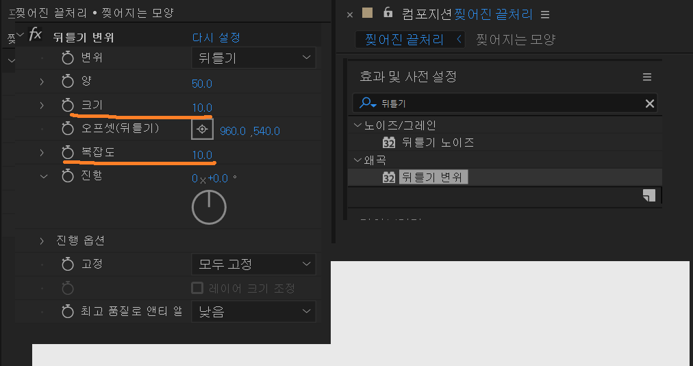 뒤틀기변위의 크기, 복잡도를 10으로 변경합니다.